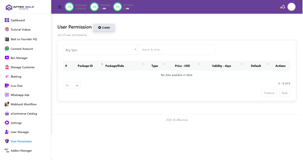 Bahagian User Permission digunakan untuk mencipta dan mengurus pakej akses (role/permission package) bagi pengguna dalam sistem AfterSale. Ini sesuai jika anda ingin hadkan fungsi tertentu untuk staf, reseller, atau sub-user.